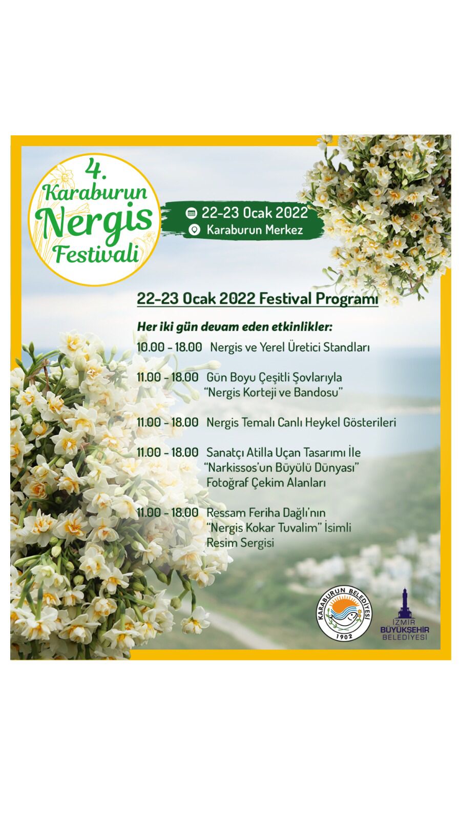2025-01-25Mis kokusuyla yüzyıllardır Karaburun topraklarını süsleyen nergis çiçeğinin büyüsüne ortak olmaya hazır mısınız? Türkiye’nin dört bir yanından ziyaretçileri ağırlayacağımız 7. Karaburun Nergis Festivali, 25-26 Ocak tarihlerinde “Nergisin Başkenti” Karaburun’da gerçekleşecek!