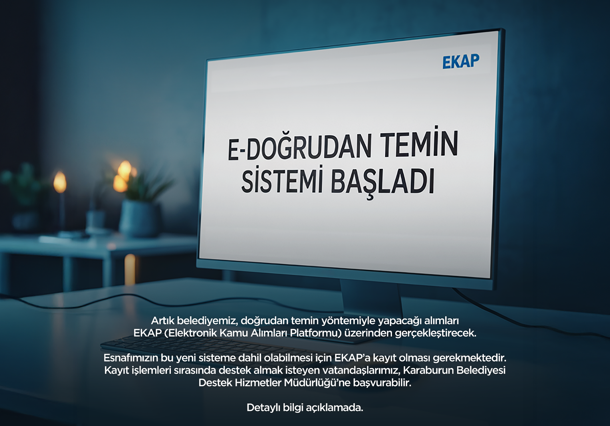 Artık belediyemiz, doğrudan temin yöntemiyle yapacağı alımları EKAP (Elektronik Kamu Alımları Platformu) üzerinden gerçekleştirecek.Esnafımızın bu yeni sisteme dahil olabilmesi için EKAP’a kayıt olması gerekmektedir. Kayıt işlemleri sırasında destek almak isteyen vatandaşlarımız, Karaburun Belediyesi Destek Hizmetler Müdürlüğü’ne başvurabilir.